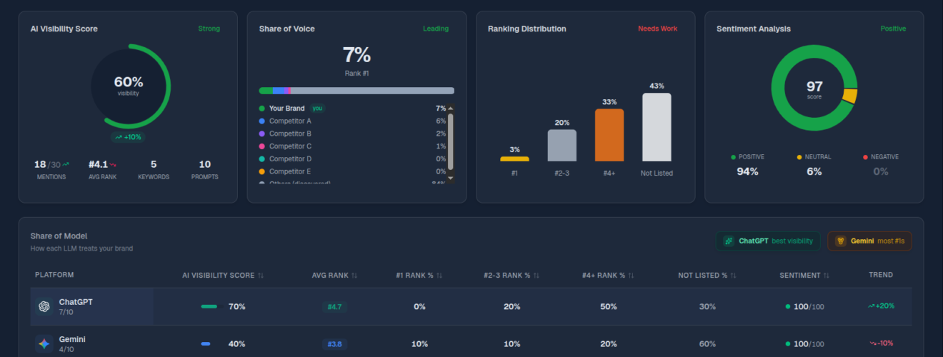 - Monitor visibility across ChatGPT, Gemini, and Perplexity